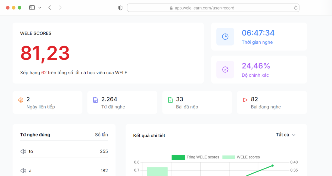 Nhằm mục đích đưa ra lộ trình học, WELE phân tích kết quả và gợi ý các bài nghe phù hợp với trình độ của bạn.